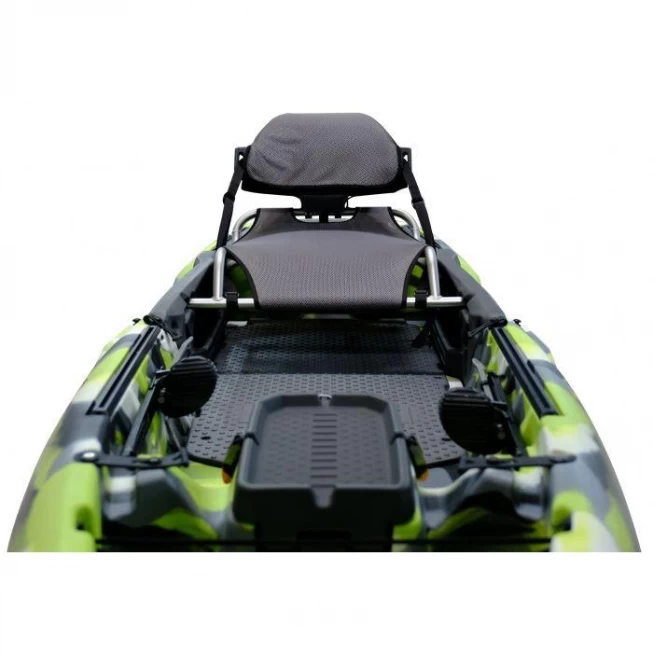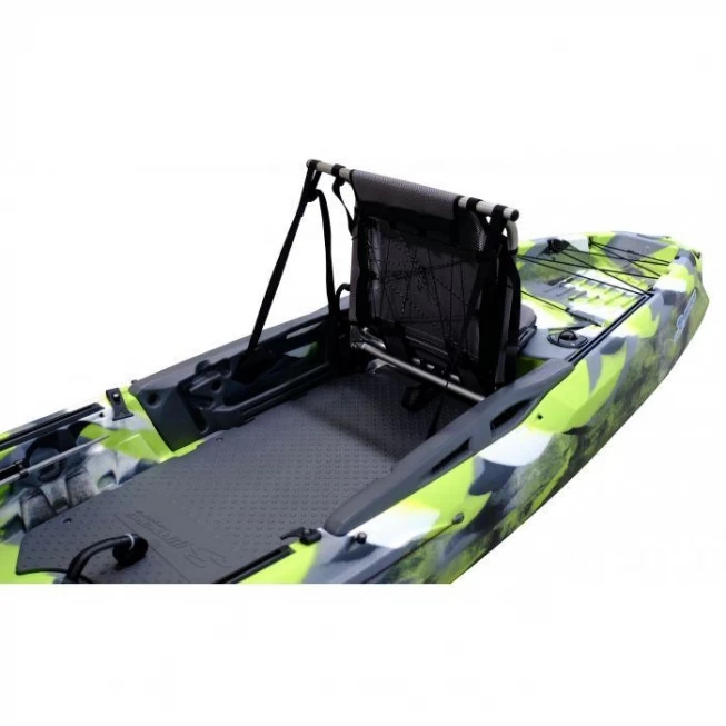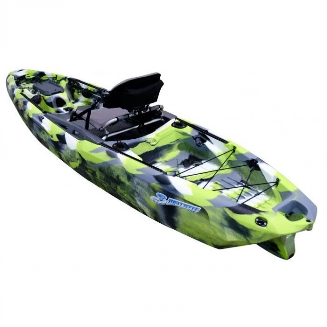The all new 3 Waters Kayaks Big Fish 120 has all the performance, comfort, and technical features you need to get on the river, lake, or ocean. The modern-style cathedral hull offers an extremely stable fishing platform, whether you’re sitting in high seat position or standing up on the reinforced standing platform. It also tracks incredibly well even without a rudder and paddles smoothly and efficiently. The Big Water seat has four positions: high, low, recline, and flip away. It can also double as a lean bar when flipped up for sight casting. Additional features include rod tip storage at the bow, a removable sonar pod, 2 molded in rod holders, bungee tankwell, 2 pairs of accessory tracks, and a molded in bow handle.