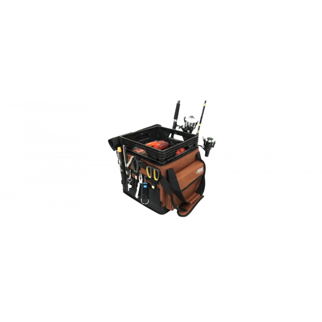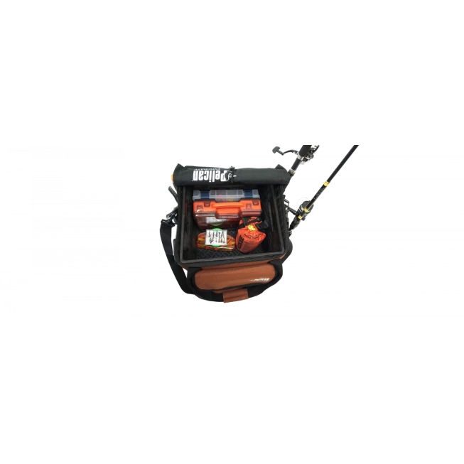 Includes two fishing rod holders with drainage holes, lined storage compartment with heavy duty zipper, multiple compartments for your tools, loops to help secure the fishing bag to the kayak, reflective logos, and removable adjustable padded shoulder strap.