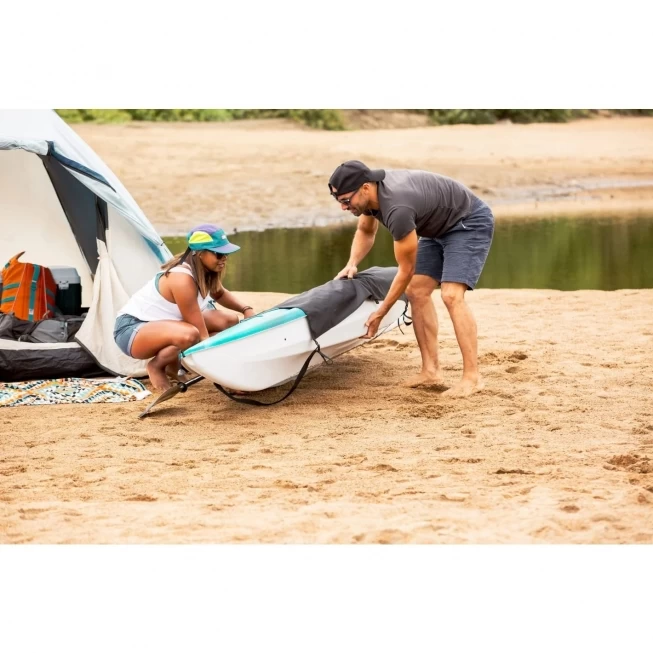 The kayak cockpit drape is designed to keep dust, sand and spider webs out of your sit-in kayak and is the perfect solution to keep your kayak clean. It’s equipped with 2 carabiners to prevent it from slipping. This cockpit drape works for sit-in kayaks with a width of up to 34 inches (86.36 cm) and is made of a water repellent 600 Denier material. Our cockpit drape is easy to install. Simply use the 3 adjustable straps with the G-hooks and wrap it around the hull of your kayak.
